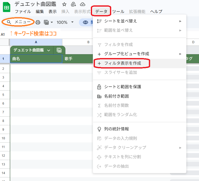 フィルター検索・並び替えは データ > フィルター表示 で並び替え出来ます。
